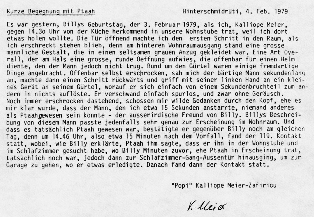 Es war gestern, Billys Geburtstag, der 3. Februar 1979, als ich, Kalliope Meier, gegen 14.30 Uhr von der Küche herkommend in unsere Wohnstube trat, weil ich dort etwas holen wollte. Die Tür öffnend machte ich den ersten Schritt in den Raum, als ich erschreckt stehen blieb, denn am hinteren Wohnraumausgang stand eine grosse männliche Gestalt, die in einen seltsamen grauen Anzug gekleidet war. Eine Art Overall, der am Hals eine grosse, runde Oeffnung aufweis, die offenbar für einen Helm diente, den der Mann jedoch nicht trug. Rund um den Gürtel waren einige fremdartige Dinge angebracht. Offenbar selbst erschrocken, sah mich der bärtige Mann sekundenlang an, machte dann einen Schritt rückwärts und griff mit seiner linken Hand an ein kleines Gerät an seinem Gürtel, worauf er sich einfach von einem Sekundenbruchteil zum andern in nichts auflöste. Er verschwand einfach spurlos, und zwar ohne Geräusch. Noch immer erschrocken dastehend, schossen mir wilde Gedanken durch den Kopf, ehe es mir klar wurde, dass der Mann, den ich etwa 15 Sekunden anstarrte, niemand anderes als Ptaah gewesen sein konnte – der ausserirdische Freund von Billy. Billys Beschreibung von diesem Mann passte jedenfalls sehr genau zur Erscheinung im Wohnraum. Und dass es tatsächlich Ptaah gewesen war, bestätigte er gegenüber Billy noch am gleichen Tag, denn um 14.46 Uhr, also etwa 15 Minuten nach dem Vorfall, fand der 119. Kontakt statt, wobei, wie Billy erklärte, Ptaah ihm sagte, dass er ihn in der Wohnstube und im Schlafzimmer gesucht habe, wo Billy Minuten zuvor, ehe Ptaah in Erscheinung trat, tatsächlich noch war, jedoch dann zur Schlafzimmer-Gang-Aussentür hinausging, um zur Garage zu gehen, wo er etwas erledigte. Danach fand dann der Kontakt statt.